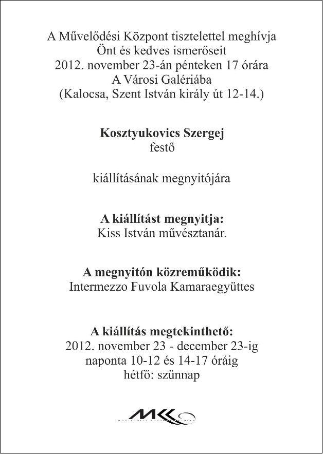 November 23-án, pénteken 17 órakor ismét tárlat nyílik a Városi Galériában. Kosztyukovics Szergej kiállítása december 23-ig lesz megtekinthető.