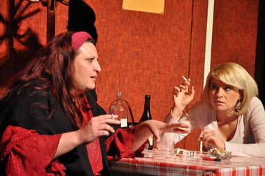 A nagyérdemű persze meglepődik, amikor belép a Kalocsai Színház tágas terébe és nem a zsöllye kényelmes plüss székébe ül le, hanem a színpadon, a kamaratermek afrikkal bélelt, már-már rozoga székére (hogy stílusos legyen), és ahol már várja a darab pincérnője keresztbe tett és felpockolt lábakkal, amint éppen keresztrejtvényt fejt, amíg a közönség a meglepetéstől lassan lehuppan valamelyik székre.