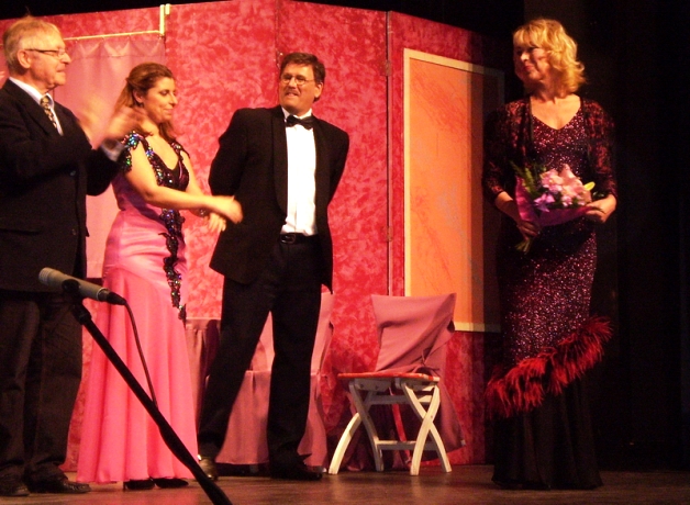 Csatlakozott hozzá az előadás egyik női főszerepét alakító Nyertes Zsuzsa, aki a tavalyi december 14-i „Nejcserés támadás” előadás napjára pontosan egy évvel, idén is városunk színházának deszkáin ünnepelte a születésnapját. – Úgy látszik, hogy én csak Kalocsán tudom megünnepelni a szülinapomat. Tavaly ezen a napon a lányom is leutazott velem és ő is a saját szemével láthatta, hogy milyen isteni az itteni közönség. Szoktuk játszani ezeket a darabokat Pesten is, de nagyon ritka, hogy ugyanolyan szeretetet kapjunk, mint a vidéki előadásokon. Hozzá kell tennem, hogy a kalocsai nemcsak lelkes, hanem egy igazán műértő közönség is – nyilatkozta lelkesen az előadás végén csokorral és vastapssal köszöntött művésznő.