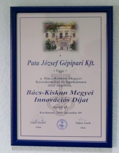 - Mindenképpen újdonság, hiszen erőfeszítéseinket 2009. 12. 15-én a Bács-Kiskun megyei Kereskedelmi és Iparkamara Innovációs Díjjal jutalmazta.
