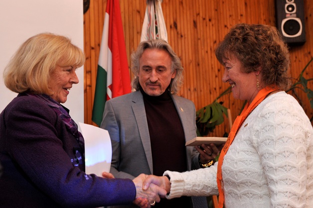 Schmittné Makray Katalin és Sasvári Sándor zászlós zarándokok átadják Az év zarándoka díjat Kiss Hajnalkának (Fotó: Kovács Attila/MTI)