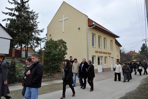 A Magyar zarándokút dél-alföldi szakaszának avatásának résztvevői a solti Szent László Zarándokközpont előtt (Fotó: Kovács Attila/MTI)