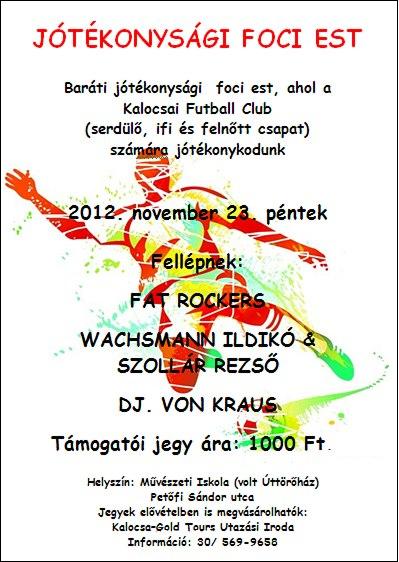 Jövő hét pénteken (november 23-án) este 8 órától egy remek buliban érezhetik jól magukat és egyben támogathatják a Kalocsai Futball Club csapatait mindazok, akik ellátogatnak az egykori Ifjúsági Házba szervezett jótékonysági estre. A hangulatról a Fat Rockers, Wachsmann Ildikó & Szollár Rezső, és DJ Von Kraus gondoskodik.