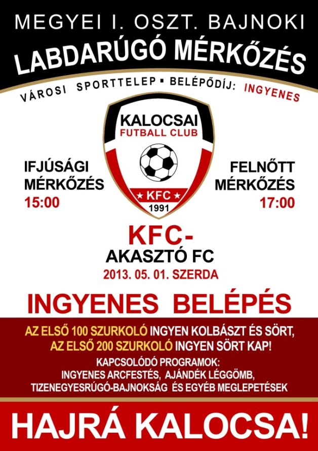 Május elsején rendhagyó Futball Fiestára várják a KFC szurkolóit a Városi Sporttelepre, ahol az Akasztó gárdája ellen lépnek pályára játékosaink. Az első száz szurkoló ingyen kolbászt, az első kétszáz szurkoló ingyen sört fog kapni!