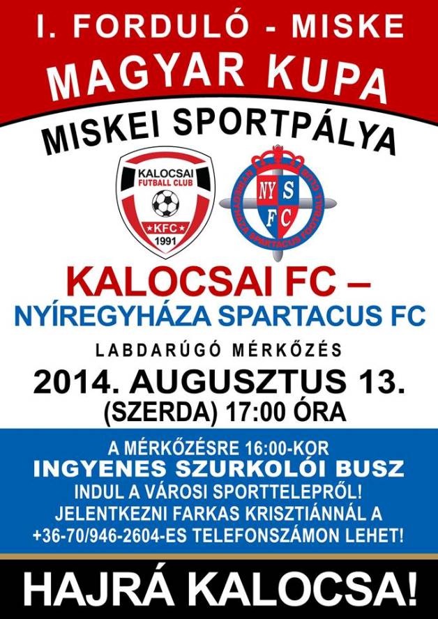 A találkozóra a klub 16 órakor ingyenes szurkolói buszt indít a Városi Sporttelepről, regisztrálni lehet Farkas Krisztiánnál a 70/ 946-26-06-os telefonszámon. A csapat hívja és várja szurkolóit a kupameccsre, jöjjön mindenki, a nagyszámú közönség legyen a tizenkettedik kalocsai játékos!