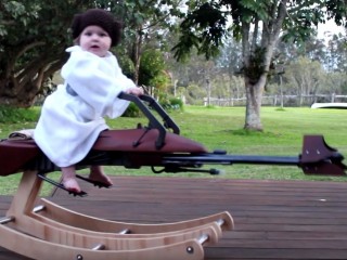 A világ egyik legjobb fej apukája saját kezűleg készítette el egyéves kislánya születésnapjára A Jedi visszatérből ismerős birodalmi sikló mocit, amely hintaló módjára funkcionálva remek játékává válik majd a csöppségnek, akinek egyelőre még édes mindegy, milyen formájú paripán is lovacskázik.