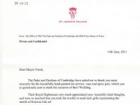 Cambridge Hercegnője nevében Mrs. Gemma Kaza fejezte ki őszinte köszönetét Kalocsa Város polgármesterének az áprilisban Vilmos herceg és Kate Middleton esküvőjére küldött nászajándékokért.