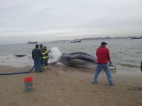 Egy hosszúszárnyú bálnát vetett partra a víz New Yorkban. A város strandján rendőrök és önkéntes tűzoltók küzdenek a hatalmas állat életéért.
