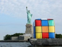 A Rubik kocka 40. születésnapja előtt tisztelegtek New Yorkban azzal, hogy egy hatalmas felfújható kockát úsztattak végig a Hudson folyón.